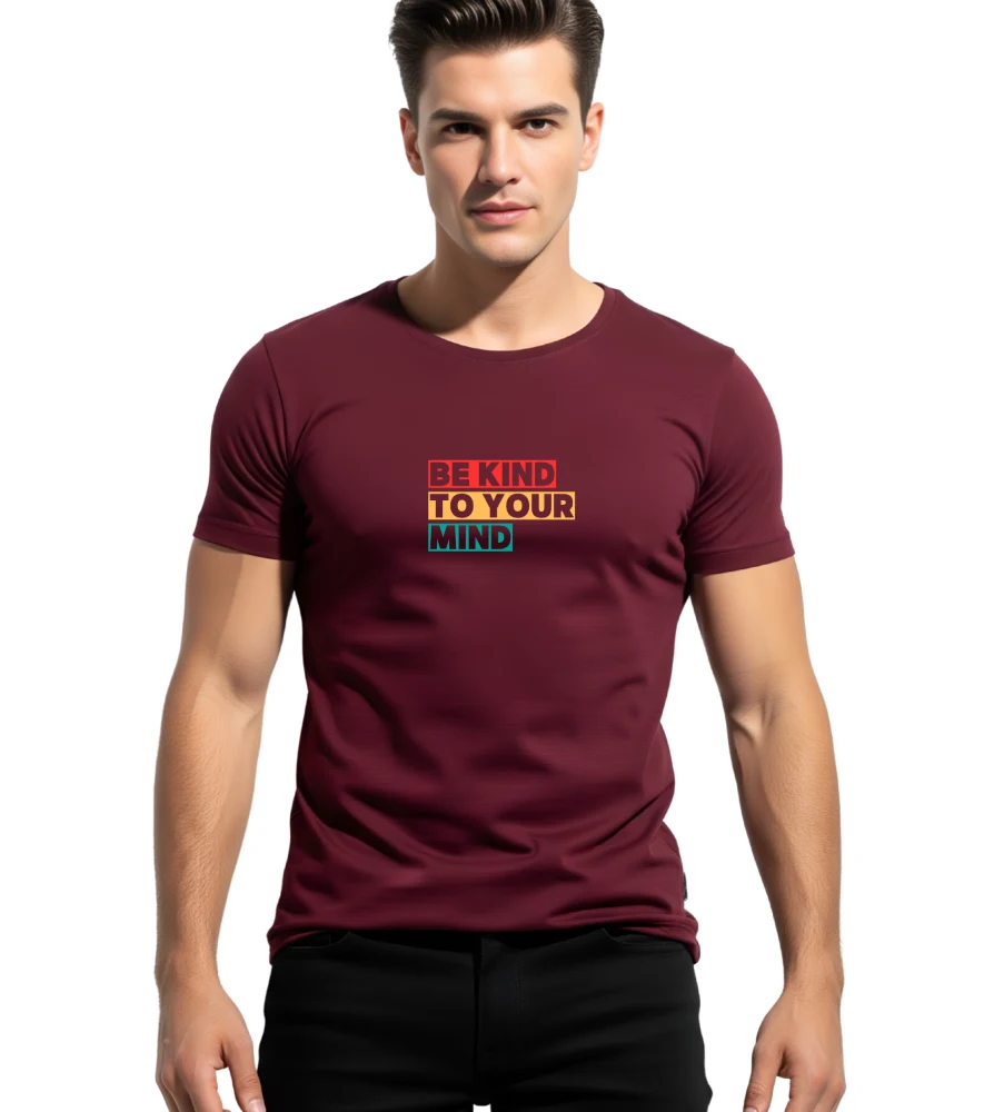 Make a bold yet mindful statement with this maroon “Be Kind to Your Mind” t-shirt. Crafted from soft, breathable cotton, this tee combines comfort with a positive message — perfect for casual outings or relaxed days.