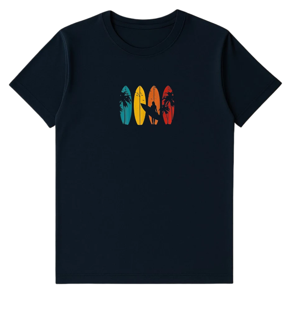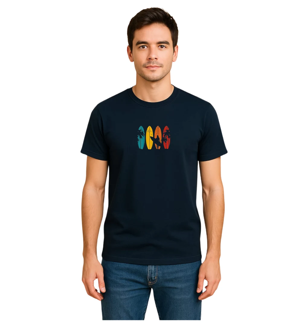 Bring the beach vibes wherever you go with this navy blue surfer graphic t-shirt. Made from 100% premium cotton, it offers a soft, breathable, and comfortable fit — perfect for casual outings or relaxed weekends. The colorful surfboard design adds a fun tropical touch to your look.