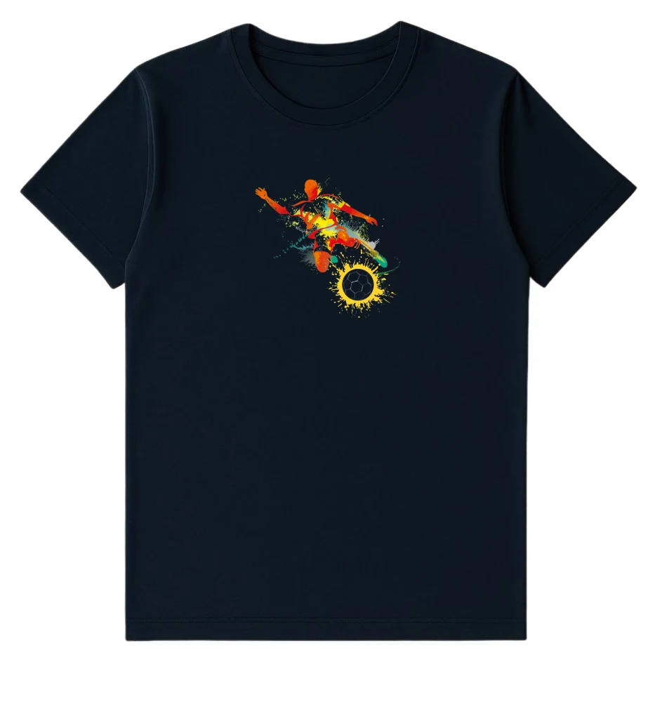 Navy Blue “Football Splash” T-Shirt featuring a vibrant football player graphic that adds an energetic vibe to your casual look. Made from soft and breathable cotton for lasting comfort and style. Perfect for everyday wear or sporty outings.