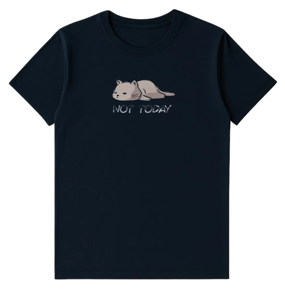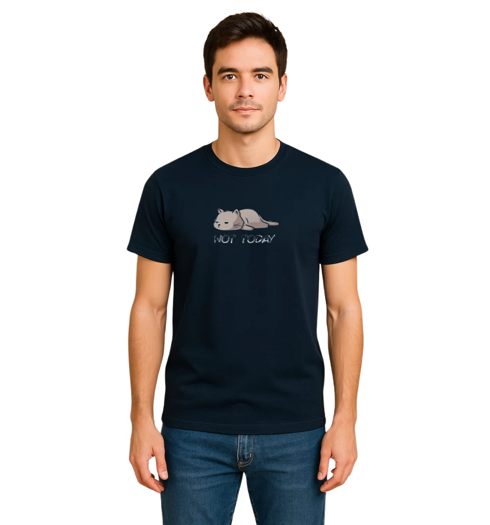 Keep it cool and comfy with this navy blue “Not Today” T-shirt featuring a cute lazy cat print. Made from premium cotton, this tee combines humour and comfort, perfect for relaxed weekends or casual outings.