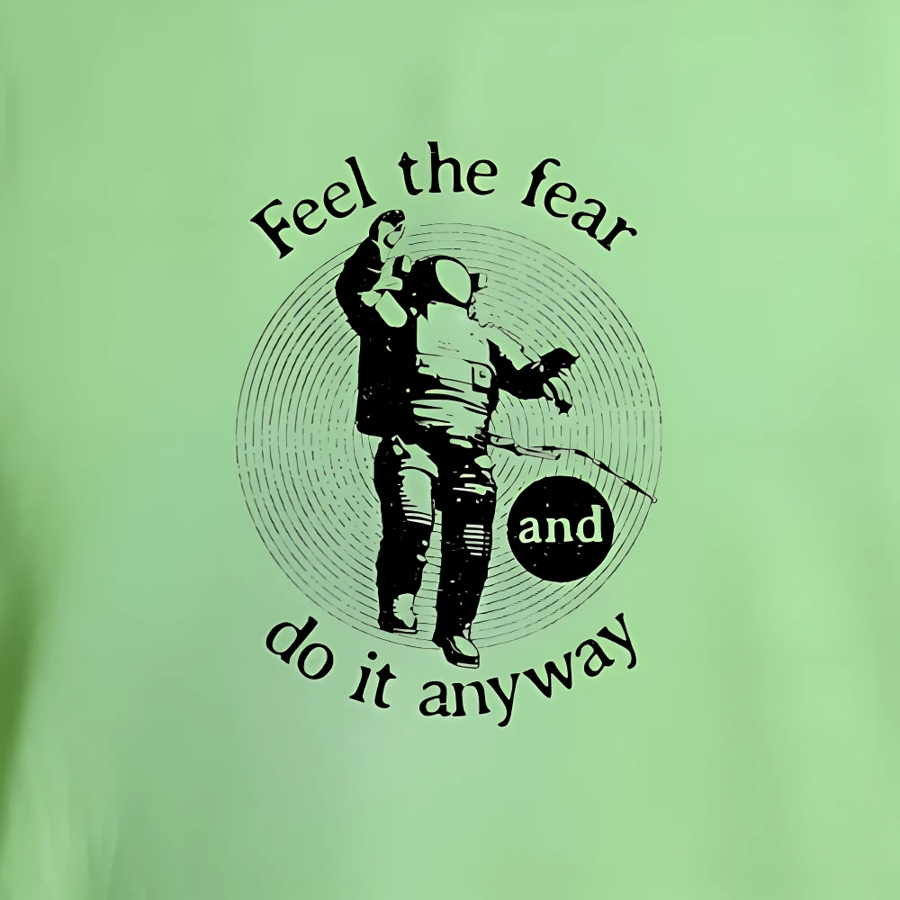 Stay inspired with this **Green Astronaut T-Shirt** featuring the quote “Feel the Fear and Do It Anyway.” Made from soft 100% cotton, it offers all-day comfort with a motivational edge — perfect for casual, everyday wear.